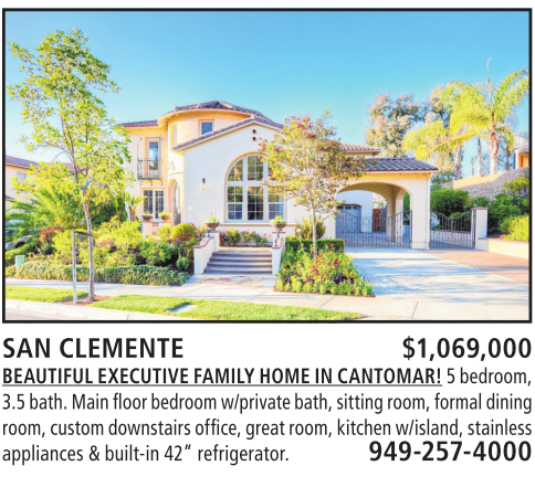 SAN CLEMENTE $1,069,000 BEAUTIFULEXECUTIVE FAMILY HOME IN CANTOMAR! 5bedroom, 3.5bath. Main floorbedroom w/private bath, sittingroom, formal dining room,customdownstairsoffice,great room,kitchen w/island,stainless appliances &built-in42” refrigerator. 949-257-4000