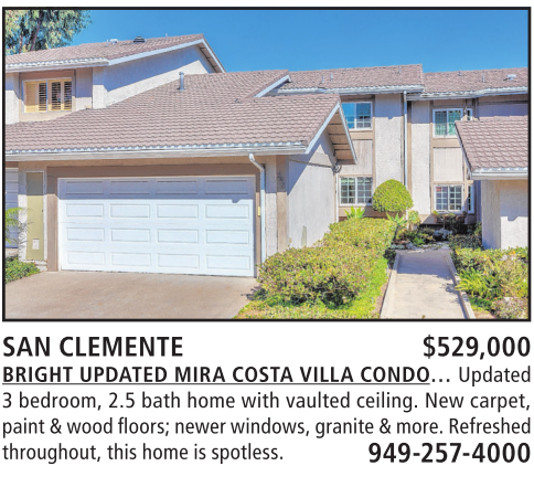 SAN CLEMENTE $529,000 BRIGHT UPDATED MIRA COSTA VILLA CONDO… Updated 3bedroom, 2.5 bath home with vaulted ceiling. New carpet, paint &wood floors;newer windows, granite&more.Refreshed throughout,thishome is spotless. 949-257-4000