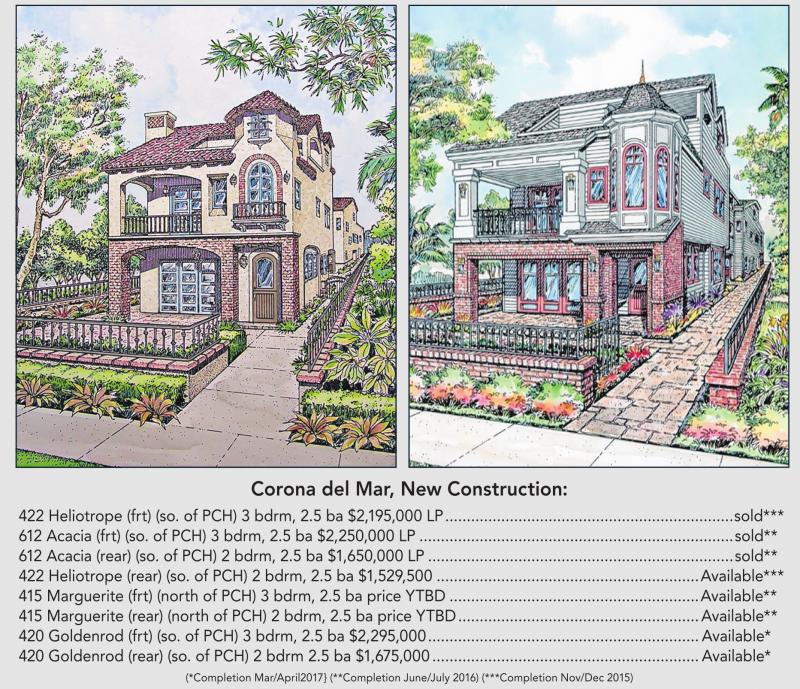 422 Heliotrope (frt) (so. of PCH) 3 bdrm, 2.5 ba $2,195,000 LP...................................................................sold*** 612 Acacia (frt) (so. of PCH) 3 bdrm, 2.5 ba $2,250,000 LP .........................................................................sold** 612 Acacia (rear) (so. of PCH) 2 bdrm, 2.5 ba $1,650,000 LP .......................................................................sold** 422 Heliotrope (rear) (so. of PCH) 2 bdrm, 2.5 ba $1,529,500 .............................................................Available*** 415 Marguerite (frt) (north of PCH) 3 bdrm, 2.5 ba price YTBD ..........................................................Available** 415 Marguerite (rear) (north of PCH) 2 bdrm, 2.5 ba price YTBD........................................................ Available** 420 Goldenrod (frt) (so. of PCH) 3 bdrm, 2.5 ba $2,295,000............................................................... Available* 420 Goldenrod (rear) (so. of PCH) 2 bdrm 2.5 ba $1,675,000.............................................................. Available*