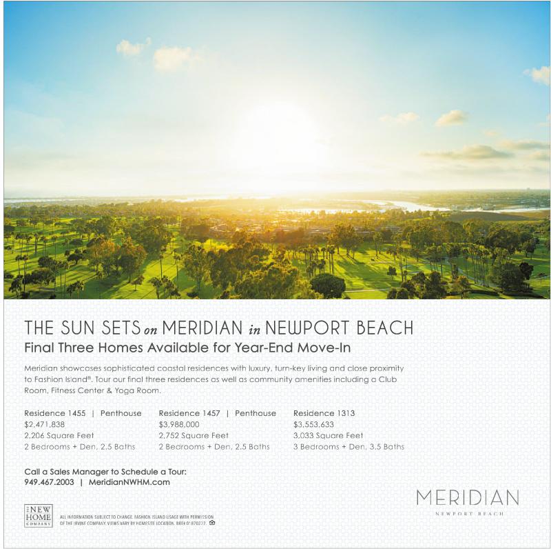 Meridian showcases sophisticated coastal residences with luxury, turn-key living and close proximity to Fashion Island ® . Tour our final three residences as well as community amenities including a Club Room, Fitness Center & Yoga Room.