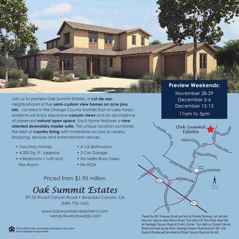 Join us to preview Oak Summit Estates, a cul-de-sac semi-custom view homes on acre plus lots. Located in the Orange County foothills East of Lake Forest, residents will enjoy expansive canyon views and an abundance of preserved natural open space. Each home features a view oriented downstairs master suite. This unique location combines the best of country living with immediate access to nearby shopping, services and entertainment venues.