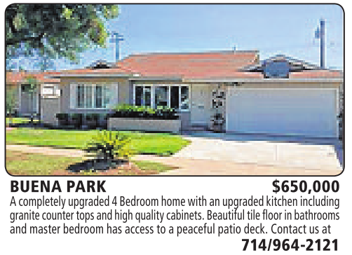 BUENA PARK $650,000 Acompletelyupgraded 4Bedroomhomewithanupgraded kitchen including granitecounter tops andhighqualitycabinets. Beautifultilefloorinbathrooms and master bedroomhas accesstoapeaceful patiodeck. Contactusat 714/964-2121