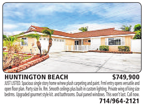 HUNTINGTON BEACH $749,900 JUST LISTED. Spacious singlestoryhome w/newplush carpeting andpaint. Frml entryopens versatileand openfloorplan. Partysize liv. Rm. Smooth ceilings plus built-in custom lighting.Private wing of king size bedrms.Upgraded gourmetstyle kit. and bathrooms. Dual panedwindows. This won’tlast. Call now.