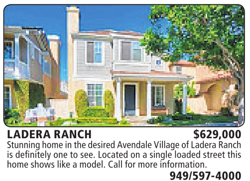 LADERA RANCH $629,000 Stunninghomeinthe desiredAvendaleVillage of Ladera Ranch is definitely one to see. Located on asingle loaded street this home showslikeamodel. Call for more information.