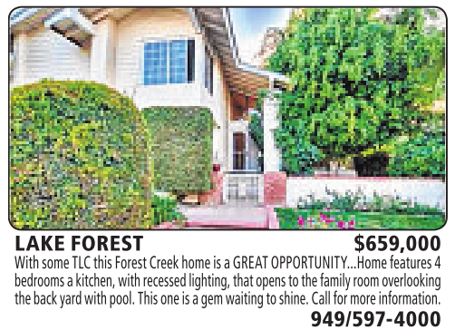 LAKE FOREST $659,000 With some TLCthis Forest CreekhomeisaGREAT OPPORTUNITY...Home features 4 bedrooms akitchen,withrecessed lighting,thatopens to thefamily roomoverlooking thebackyardwithpool. This one is agem waiting to shine. Call for more information.