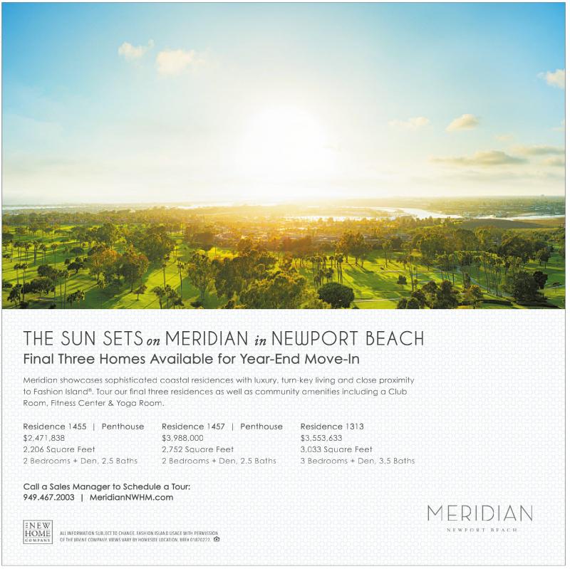 THE SUN ETS on MERIDIAN in NEWPORT BEACH Final Three Homes Available for Year-End Move-In Meridian showcases sophisticated coastal residences with luxury, turn-key living and close proximity to Fashion Island ® . Tour our final three residences as well as community amenities including a Club Room, Fitness Center & Yoga Room. Residence 1455 | Penthouse $2,471,838 2,206 Square Feet 2 Bedrooms + Den, 2.5 Baths Residence 1457 | Penthouse $3,988,000 2,752 Square Feet 2 Bedrooms + Den, 2.5 Baths Residence 1313 $3,553,633 3,033 Square Feet 3 Bedrooms + Den, 3.5 Baths Call a Sales Manager to Schedule a Tour: 949.467.2003 | MeridianNWHM.com ALL INFORMATION SUBJECT TO CHANGE. FASHION ISLAND USAGE WITH PERMISSION OF THE IRVINE COMPANY. VIEWS VARY BY HOMESITE LOCATION. BRE# 01870227.