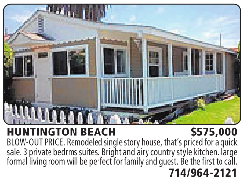 HUNTINGTON BEACH $575,000 BLOW-OUT PRICE.Remodeledsinglestory house, that’s pricedfor aquick sale.3privatebedrms suites. Bright and airycountry style kitchen. large formal living room will be perfectfor family andguest.Bethe first to call. 714/964-2121 See also
