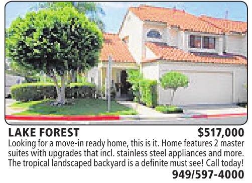 LAKE FOREST $517,000 Looking for amove-inready home,this is it.Homefeatures2master suites with upgrades that incl.stainless steelappliancesand more. Thetropical landscapedbackyard is adefinite mustsee!Calltoday!