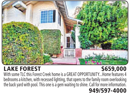 LAKE FOREST $659,000 With some TLCthis Forest CreekhomeisaGREAT OPPORTUNITY...Home features 4 bedrooms akitchen,withrecessed lighting,thatopens to thefamily roomoverlooking thebackyardwithpool. This one is agem waiting to shine. Call for more information.