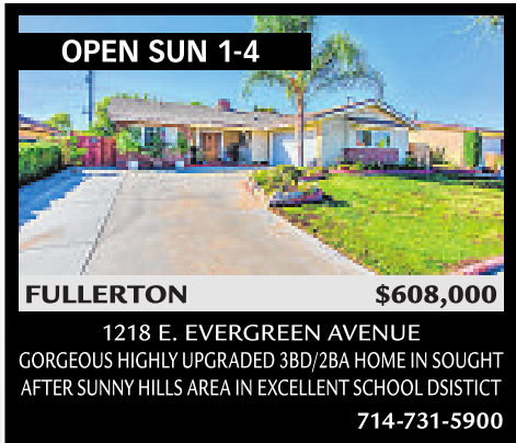 1218 E. EVERGREENAVENUE GORGEOUS HIGHLY UPGRADED 3BD/2BAHOMEINSOUGHT AFTER SUNNY HILLS AREA IN EXCELLENT SCHOOL DSISTICT 714-731-5900