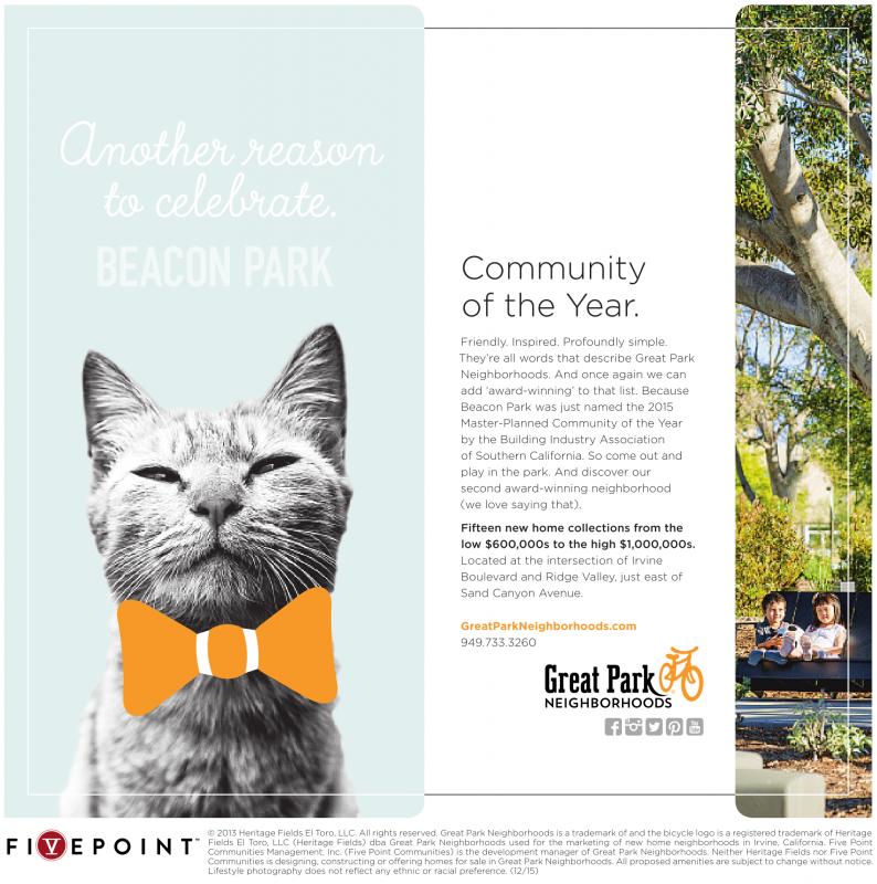 Another reason to celebrate. BEACON PARK Community of the Year. Friendly. Inspired. Profoundly simple. They’re all words that describe Great Park Neighborhoods. And once again we can add ‘award-winning’ to that list. Because Beacon Park was just named the 2015 Master-Planned Community of the Year by the Building Industry Association of Southern California. So come out and play in the park. And discover our second award-winning neighborhood (we love saying that). Fifteen new home collections from the low $600,000s to the high $1,000,000s. Located at the intersection of Irvine Boulevard and Ridge Valley, just east of Sand Canyon Avenue. GreatParkNeighborhoods.com 949.733.3260 ©2013 Heritage Fields El Toro, LLC. All rights reserved. Great Park Neighborhoods is atrademark of and the bicycle logo is aregistered trademark of Heritage Fields El Toro, LLC (Heritage Fields) dba Great Park Neighborhoods used for the marketing of new home neighborhoods in Irvine, California. Five Point Communities Management, Inc. (Five Point Communities) is the development manager of Great Park Neighborhoods. Neither Heritage Fields nor Five Point Communities is designing, constructing or offering homes for sale in Great Park Neighborhoods. All proposed amenities are subject to change without notice. Lifestyle photography does not reflect any ethnic or racial preference. (12/15)
