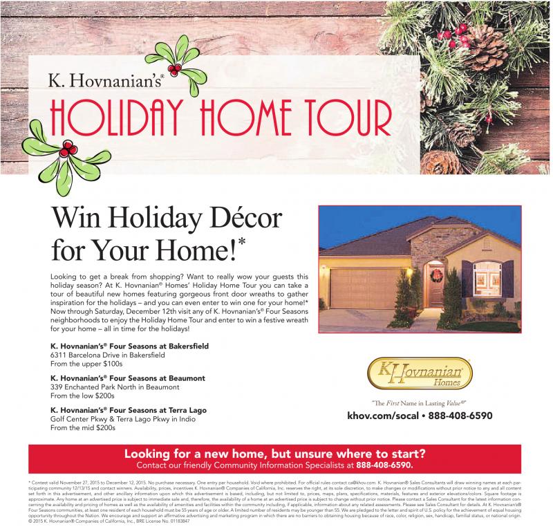 *Contest valid November 27, 2015 to December 12, 2015. No purchase necessary. One entry per household. Void where prohibited. For official rules contact ca@khov.com. K. Hovnanian® Sales Consultants will draw winning names at each participating community 12/13/15 and contact winners. Availability, prices, incentives K. Hovnanian® Companies of California, Inc. reserves the right, at its sole discretion, to make changes or modifications without prior notice to any and all content set forth in this advertisement, and other ancillary information upon which this advertisement is based, including, but not limited to, prices, maps, plans, specifications, materials, features and exterior elevations/colors. Square footage is approximate. Any home at an advertised price is subject to immediate sale and, therefore, the availability of ahome atanadvertised price is subject to change without prior notice. Please contact aSales Consultant for the latest information concerning the availability and pricing of homes as well as the availability of amenities and facilities within the community including, if applicable, information about any related assessments. Please see Sales Consultant for details. At K. Hovnanian’s® Four Seasons communities, at least one resident of each household must be 55 years of age or older.Alimited number of residents may be younger than 55. We arepledged to the letter and spirit of U.S. policy for the achievement of equal housing opportunity throughout the Nation. We encourage and support an affirmative advertising and marketing program in which there are no barriers toobtaining housing because ofrace, color, religion, sex, handicap, familial status, or national origin. ©2015 K. Hovnanian® Companies of California, Inc., BRE License No. 01183847