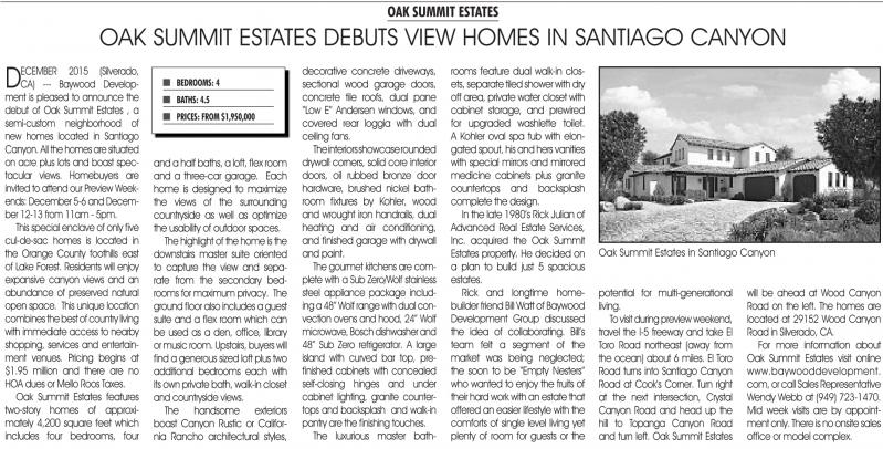 2015 (Silverado, Ca) --- Baywood Development is pleased to announce the debut of Oak Summit Estates , asemi-custom neighborhood of new homes located in Santiago Canyon. all the homes are situated on acre plus lots and boast spectacular views. Homebuyers are invited to attend our Preview weekends: December5-6 and December