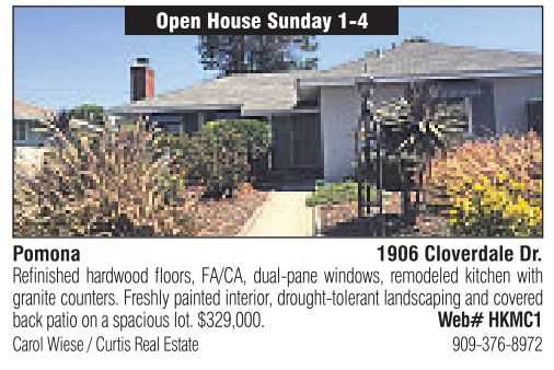 Pomona Open House Sunday 1-4 1906 Cloverdale Dr. CarolWiese /Curtis Real Estate 909-376-8972 granitecounters. Freshly painted interior,drought-tolerant landscaping and covered Refinished hardwood floors, FA/CA, dual-pane windows, remodeled kitchen with back patioonaspaciouslot.$329,000. Web# HKMC1
