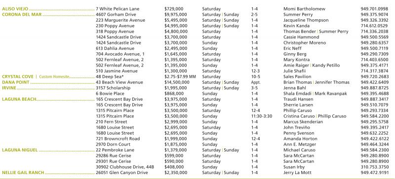 ALISO VIEJO ...................................................... 7 White Pelican Lane $729,000 Saturday 1-4 Momi Bartholomew 949.701.0998 CORONA DEL MAR........................................... 4607 Gorham Drive $9,975,000 Saturday | Sunday 2-5 Summer Perry 949.375.9074 223 Marguerite Avenue $5,495,000 Saturday | Sunday 1-4 Jacqueline Thompson 949.326.3392 230 Poppy Avenue $4,995,000 Saturday | Sunday 1-4 Kevin Kanda 714.612.0529 318 Poppy Avenue $4,800,000 Saturday 1-4 Thomas Bender | Summer Perry 714.336.2038 1424 Sandcastle Drive $3,700,000 Saturday 1-4 Cassie Hammond 949.500.5569 1424 Sandcastle Drive $3,700,000 Sunday 1-4 Christopher Moreno 949.280.6357 613 Dahlia Avenue $2,495,000 Sunday 1-4 Eric Neff 949.500.7119 704 Avocado Avenue, 1 $1,645,000 Saturday 1-4 Ginny Berg 949.290.7309 502 Fernleaf Avenue, 2 $1,395,000 Saturday 1-4 Mary Kontra 714.403.6500 502 Fernleaf Avenue, 2 $1,395,000 Sunday 1-4 Amie Raiger | Kandy Petillo 949.375.4171 510 Jasmine Avenue $1,300,000 Saturday 12-3 Julie Shafii 714.317.3874 CRYSTAL COVE | Custom Homesite..................... 48 Deep Sea* $2.75-$7.99 MM Saturday 10-5 Sales Pavilion 949.720.2683 DANA POINT..................................................... 43 Beach View Avenue $14,500,000 Saturday | Sunday Appt. Brian Thomas | Jennifer Thomas 949.422.6409 IRVINE................................................................ 3157 Scholarship $1,995,000 Saturday | Sunday 3-5 Jenna Bahl 949.887.8725 6 Bowie Place $868,000 Sunday 1-4 Shala Emdadi | Mark Ravanpak 949.395.4688 LAGUNA BEACH................................................ 165 Crescent Bay Drive $3,975,000 Saturday 1-4 Traudi Hansen 949.887.3417 165 Crescent Bay Drive $3,975,000 Sunday 1-4 Sherrie Larsen 949.510.7079 1315 Pitcairn Place $3,500,000 Saturday 12-4 Phillip Caruso 949.293.7334 1315 Pitcairn Place $3,500,000 Sunday 11:30-3:30 Cristina Caruso | Phillip Caruso 949.584.2200 210 Fern Street $2,999,000 Sunday 1-4 Marcus Skenderian 949.295.5758 1680 Louise Street $2,695,000 Saturday 1-4 John Treviño 949.395.2417 1680 Louise Street $2,695,000 Sunday 1-4 Penny Svenson 949.632.2252 721 Browncroft Road $1,999,000 Sunday 12-4 Amanda Horton 949.422.6122 2970 Dorn Court $1,875,000 Sunday 1-4 Ann E. Metzger 949.464.3244 LAGUNA NIGUEL.............................................. 22 Pembroke Lane $1,379,000 Saturday | Sunday 1-4 Michael Caruso 949.584.2300 29286 Rue Cerise $599,000 Saturday 1-4 Sara McCartan 949.280.8900 29301 Rue Cerise $590,000 Saturday 1-4 Sara McCartan 949.280.8900 30902 Clubhouse Drive, 44B $408,000 Sunday 1-4 Susan Irby 310.753.3750 NELLIE GAIL RANCH ......................................... 26051 Glen Canyon Drive $2,350,000 Saturday | Sunday 1-4 Jerry La Mott 949.472.9191