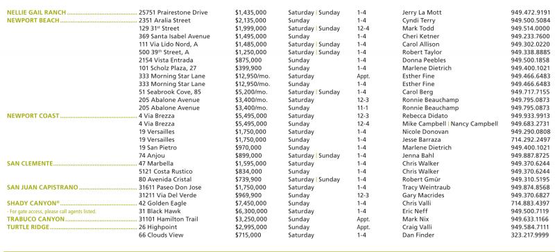 NELLIE GAIL RANCH......................................... 25751 Prairestone Drive $1,435,000 Saturday | Sunday 1-4 Jerry La Mott 949.472.9191 NEWPORT BEACH............................................. 2351 Aralia Street $2,135,000 Sunday 1-4 Cyndi Terry 949.500.5084 129 31 st Street $1,999,000 Saturday | Sunday 12-4 Mark Todd 949.514.0000 369 Santa Isabel Avenue $1,495,000 Sunday 1-4 Cheri Ketner 949.233.7600 111 Via Lido Nord, A $1,485,000 Saturday | Sunday 1-4 Carol Allison 949.302.0220 500 39 th Street, A $1,250,000 Saturday | Sunday 1-4 Robert Taylor 949.338.8885 2154 Vista Entrada $875,000 Sunday 1-4 Donna Peebles 949.500.1858 101 Scholz Plaza, 27 $399,900 Sunday 1-4 Marlene Dietrich 949.400.1021 333 Morning Star Lane $12,950/mo. Saturday Appt. Esther Fine 949.466.6483 333 Morning Star Lane $12,950/mo. Sunday 1-4 Esther Fine 949.466.6483 51 Seabrook Cove, 85 $5,200/mo. Saturday | Sunday 1-4 Carol Berg 949.717.7155 205 Abalone Avenue $3,400/mo. Saturday 12-3 Ronnie Beauchamp 949.795.0873 205 Abalone Avenue $3,400/mo. Sunday 11-1 Ronnie Beauchamp 949.795.0873 NEWPORT COAST............................................. 4 Via Brezza $5,495,000 Saturday 12-3 Rebecca Didato 949.933.9913 4 Via Brezza $5,495,000 Sunday 12-4 Mike Campbell | Nancy Campbell 949.683.2731 19 Versailles $1,750,000 Saturday 1-4 Nicole Donovan 949.290.0808 19 Versailles $1,750,000 Sunday 1-4 Jesse Barraza 714.292.2497 19 San Pietro $970,000 Sunday 1-4 Marlene Dietrich 949.400.1021 74 Anjou $899,000 Saturday | Sunday 1-4 Jenna Bahl 949.887.8725 SAN CLEMENTE................................................. 47 Marbella $1,595,000 Saturday 1-4 Chris Walker 949.370.6244 5121 Costa Rustico $834,000 Sunday 1-4 Chris Walker 949.370.6244 80 Avenida Cristal $739,900 Saturday | Sunday 1-4 Robert Gmür 949.310.5195 SAN JUAN CAPISTRANO.................................. 31611 Paseo Don Jose $1,750,000 Saturday 1-4 Tracy Weintraub 949.874.8568 31211 Via Del Verde $969,900 Sunday 12-3 Gary Macrides 949.370.6827 SHADY CANYON ® ............................................. 42 Golden Eagle $7,450,000 Sunday 1-4 Chris Valli 714.883.4397 -For gate access,pleasecallagentslisted. ....................... 31 Black Hawk $6,300,000 Saturday 1-4 Eric Neff 949.500.7119 TRABUCO CANYON.......................................... 31101 Hamilton Trail $3,250,000 Sunday Appt. Mark Nix 949.633.1166 TURTLE RIDGE................................................... 26 Highpoint $2,995,000 Sunday Appt. Craig Valli 949.584.7111 66 Clouds View $715,000 Saturday 1-4 Dan Finder 323.217.9999