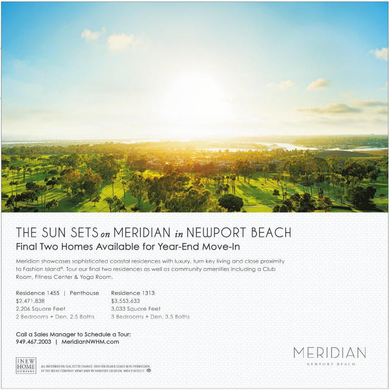 THE SUN ETS on MERIDIAN in NEWPORT BEACH Final Two Homes Available for Year-End Move-In Meridian showcases sophisticated coastal residences with luxury, turn-key living and close proximity to Fashion Island ® . Tour our final two residences as well as community amenities including a Club Room, Fitness Center & Yoga Room. Residence 1455 | Penthouse $2,471,838 2,206 Square Feet 2 Bedrooms + Den, 2.5 Baths Residence 1313 $3,553,633 3,033 Square Feet 3 Bedrooms + Den, 3.5 Baths Call a Sales Manager to Schedule a Tour: 949.467.2003 | MeridianNWHM.com ALL INFORMATION SUBJECT TO CHANGE. FASHION ISLAND USAGE WITH PERMISSION OF THE IRVINE COMPANY. VIEWS VARY BY HOMESITE LOCATION. BRE# 01870227.