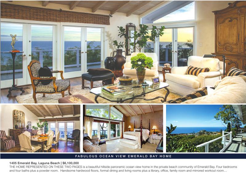1405 Emerald Bay, Laguna Beach | $6,100,000 THE HOME REPRESENTED ON THESE TWO PAGES is a beautiful hillside panoramic ocean view home in the private beach community of Emerald Bay. Four bedrooms and four baths plus a powder room. Handsome hardwood floors, formal dining and living rooms plus a library, office, family room and mirrored workout room…