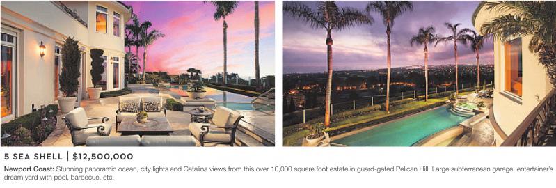Newport Coast: Stunning panoramic ocean, city lights and Catalina views from this over 10,000 square foot estate in guard-gated Pelican Hill. Large subterranean garage, entertainer’s dream yard with pool, barbecue, etc.