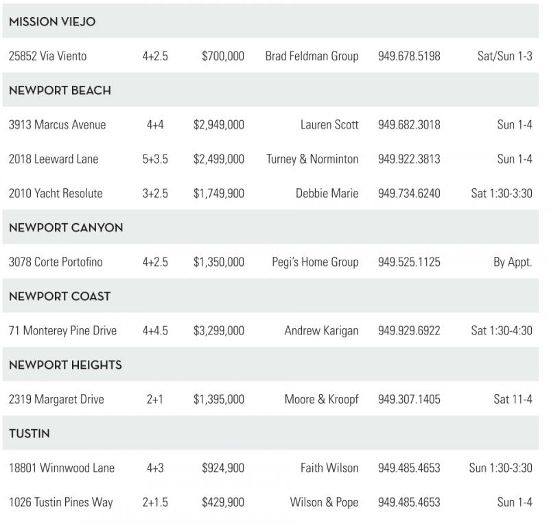 25852 ViaViento 4+2.5 $700,000 Brad Feldman Group 949.678.5198 Sat/Sun 1-3 NEWPORTBEACH 3913 Marcus Avenue 4+4 $2,949,000 Lauren Scott 949.682.3018 Sun 1-4 2018 Leeward Lane 5+3.5 $2,499,000 Turney &Norminton 949.922.3813 Sun 1-4 2010 YachtResolute 3+2.5 $1,749,900 Debbie Marie 949.734.6240 Sat 1:30-3:30 NEWPORTCANYON 3078 Corte Portofino 4+2.5 $1,350,000 Pegi’sHome Group 949.525.1125 By Appt. NEWPORTCOAST 71 Monterey Pine Drive 4+4.5 $3,299,000 Andrew Karigan 949.929.6922 Sat 1:30-4:30 NEWPORTHEIGHTS 2319 Margaret Drive 2+1 $1,395,000 Moore &Kroopf 949.307.1405 Sat 11-4 TUSTIN 18801 Winnwood Lane 4+3 $924,900 Faith Wilson 949.485.4653 Sun 1:30-3:30 1026 Tustin Pines Way 2+1.5 $429,900 Wilson &Pope 949.485.4653 Sun 1-4