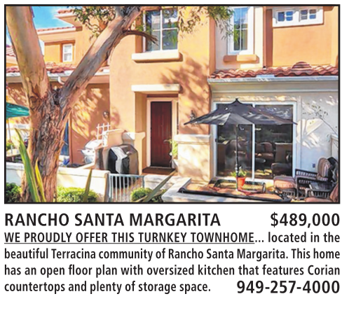 RANCHO SANTA MARGARITA $489,000 WE PROUDLY OFFER THIS TURNKEY TOWNHOME... located inthe beautiful TerracinacommunityofRancho SantaMargarita. This home has anopen floor plan with oversized kitchen that features Corian countertops and plenty ofstorage space. 949-257-4000