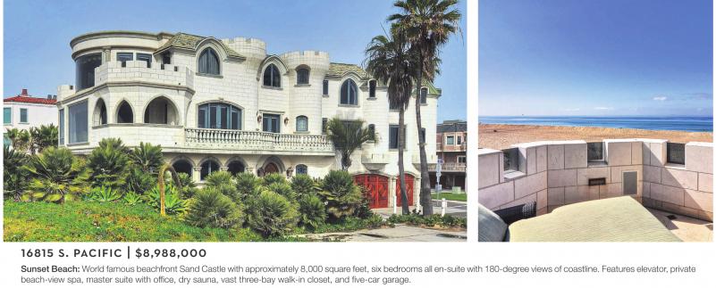 Sunset Beach: World famous beachfront Sand Castle with approximately 8,000 square feet, six bedrooms all en-suite with 180-degree views of coastline. Features elevator, private beach-view spa, master suite with office, dry sauna, vast three-bay walk-in closet, and five-car garage.
