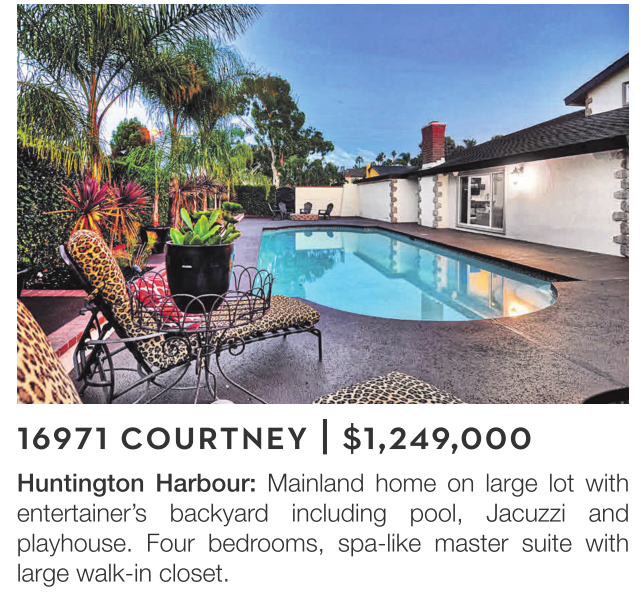 Huntington Harbour: Mainland home on large lot with entertainer’s backyard including pool, Jacuzzi and playhouse. Four bedrooms, spa-like master suite with large walk-in closet.