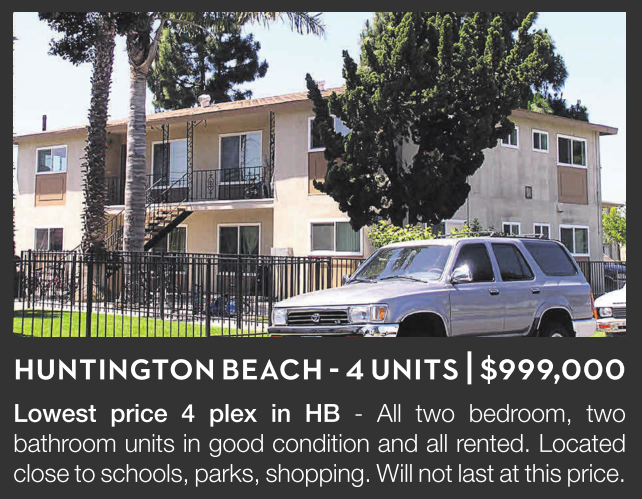Lowest price 4 plex in HB - All two bedroom, two bathroom units in good condition and all rented. Located close to schools, parks, shopping.Will not lastatthis price.