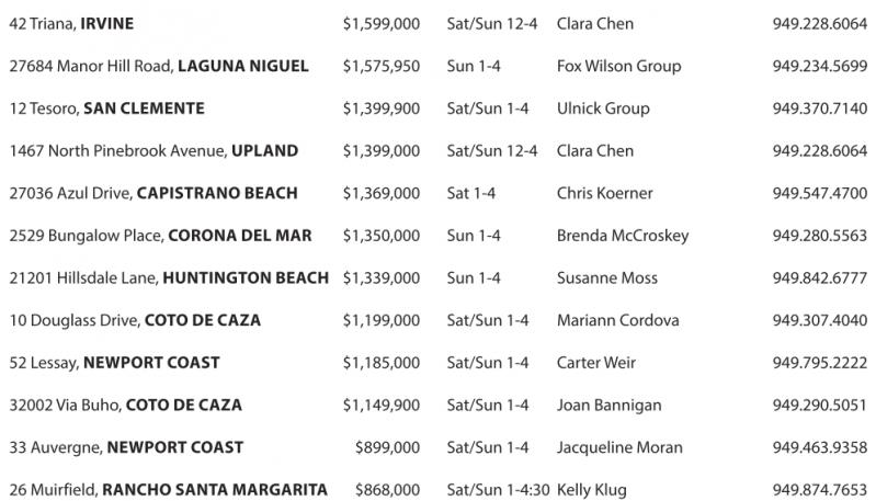 42 Triana, IRVINE $1,599,000 Sat/Sun 12-4 Clara Chen 949.228.6064 27684 Manor Hill Road, LAGUNA NIGUEL $1,575,950 Sun1-4 FoxWilsonGroup 949.234.5699 12 Tesoro, SAN CLEMENTE $1,399,900 Sat/Sun 1-4 Ulnick Group 949.370.7140 1467 North Pinebrook Avenue, UPLAND $1,399,000 Sat/Sun 12-4 Clara Chen 949.228.6064 27036 Azul Drive, CAPISTRANO BEACH $1,369,000 Sat1-4 Chris Koerner 949.547.4700 2529 Bungalow Place, CORONA DELMAR $1,350,000 Sun1-4 Brenda McCroskey 949.280.5563 21201 Hillsdale Lane, HUNTINGTON BEACH $1,339,000 Sun 1-4 Susanne Moss 949.842.6777 10 Douglass Drive, COTO DE CAZA $1,199,000 Sat/Sun 1-4 Mariann Cordova 949.307.4040 52 Lessay, NEWPORT COAST $1,185,000 Sat/Sun 1-4 Carter Weir 949.795.2222 32002 ViaBuho, COTO DE CAZA $1,149,900 Sat/Sun 1-4 Joan Bannigan 949.290.5051 33 Auvergne, NEWPORT COAST $899,000 Sat/Sun 1-4 Jacqueline Moran 949.463.9358 26 Muirfield, RANCHO SANTAMARGARITA $868,000 Sat/Sun 1-4:30 Kelly Klug 949.874.7653