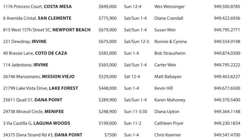 1176 Princess Court, COSTAMESA $849,000 Sun 12-4 WesWeissinger 949.500.8785 6Avenida Cristal, SAN CLEMENTE $775,900 Sat/Sun 1-4 Diana Crandall 949.422.6936 815 West 15ThStreet 5C, NEWPORT BEACH $679,000 Sat/Sun 1-4 Susan Weir 949.795.2771 221 Dewdrop, IRVINE $675,000 Sat/Sun 12-5 Ronnie &Cyrena 949.554.9198 40 Brassie Lane, COTO DE CAZA $585,000 Sun 1-4 Bob Strausheim 949.874.0300 114 Jadestone, IRVINE $565,000 Sat/Sun 1-4 Carter Weir 949.795.2222 26746 Manzanares, MISSION VIEJO $529,000 Sat 12-4 Matt Babayan 949.463.6227 21799 Lake Vista Drive, LAKE FOREST $448,000 Sun 1-4 Kevin Hill 949.677.6500 25611 Quail 51, DANA POINT $289,900 Sat/Sun 1-4 KarenMahoney 949.370.5400 29738 Mirasol Circle, MENIFEE $248,900 Sun 11-3:30 Diana Upton 949.364.1148 3Via Castilla G, LAGUNA WOODS $199,000 Sun 11-2 Cathleen Pryor 949.230.1834 34375 Dana Strand Rd #3, DANA POINT $7500 Sun 1-4 Chris Koerner 949.547.4700