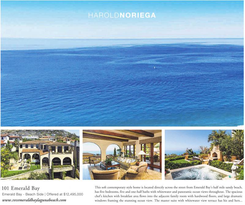 28 101 Emerald Bay Emerald Bay - Beach Side | Offered at $12,495,000 www.101emeraldbaylagunabeach.com This soft contemporary style home is located directly across the street from Emerald Bay’s half mile sandy beach, has five bedrooms, five and one-half baths with whitewater and panoramic ocean views throughout. The spacious chef’s kitchen with breakfast area flows into the adjacent family room with hardwood floors, and large dramatic windows framing the stunning ocean view. The master suite with whitewater view terrace has his and hers...