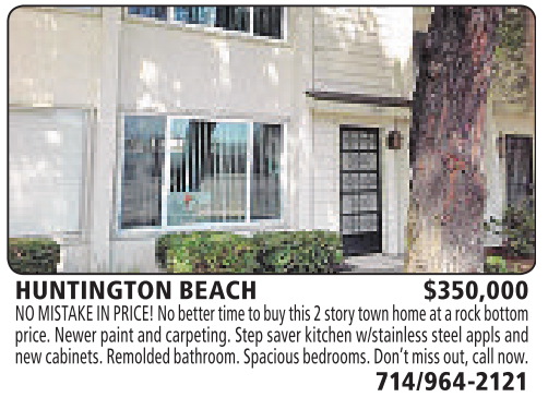 HUNTINGTON BEACH $350,000 NO MISTAKEINPRICE!Nobettertimetobuy this 2storytownhomeatarock bottom price.Newer paintand carpeting.Stepsaver kitchen w/stainless steel applsand newcabinets. Remolded bathroom. Spacious bedrooms.Don’t missout,callnow. 714/964-2121 See also