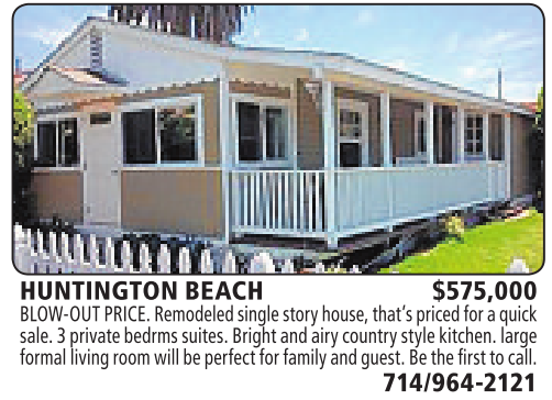 HUNTINGTON BEACH $575,000 BLOW-OUT PRICE.Remodeledsinglestory house, that’s pricedfor aquick sale.3privatebedrms suites. Bright and airycountry style kitchen. large formal living room will be perfectfor family andguest.Bethe first to call. 714/964-2121 See also