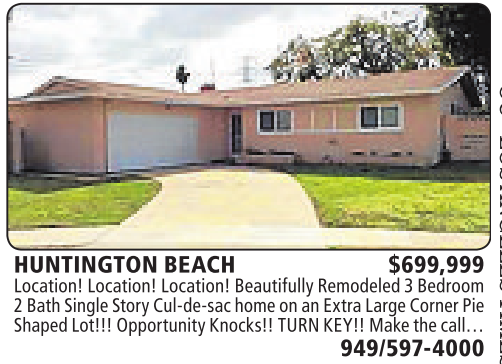 HUNTINGTON BEACH $699,999 Location! Location! Location! BeautifullyRemodeled3Bedroom 2BathSingleStory Cul-de-sac home on an ExtraLarge Corner Pie ShapedLot!!! OpportunityKnocks!!TURN KEY!!Makethe call… 949/597-4000