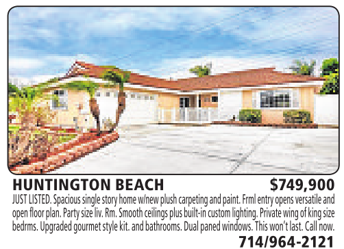 HUNTINGTON BEACH $749,900 JUST LISTED. Spacious singlestoryhome w/newplush carpeting andpaint. Frml entryopens versatileand openfloorplan. Partysize liv. Rm. Smooth ceilings plus built-in custom lighting. Private wing of king size bedrms.Upgraded gourmetstyle kit. and bathrooms. Dual panedwindows. This won’tlast. Call now. 714/964-2121 See also