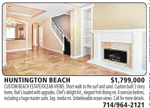 HUNTINGTON BEACH $1,799,000 CUSTOM BEACHESTATE/OCEANVIEWS.Shortwalk to thesurfand sand. Custom built3story home, that’s loadedwithupgrades. Chef’s delight kit., elegantfrmldiningrm, 4oversize bedrms, including ahugemaster suite. Sep.media rm.Unbelievable oceanviews. Call for more details.