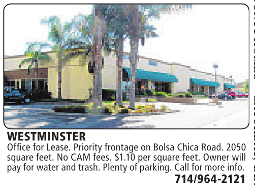 WESTMINSTER Office for Lease. Priority frontage on Bolsa Chica Road. 2050 square feet. NoCAM fees. $1.10 per square feet. Owner will payfor water and trash. Plenty of parking. Call for more info.