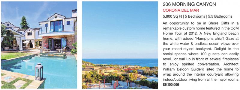 206 MORNING CANYON CORONA DEL MAR 5,800 Sq Ft | 5 Bedrooms | 5.5 Bathrooms remarkable custom home featured in the CdM Home Tour of 2012. A New England beach home, with added "Hamptons chic”! Gaze at the white water & endless ocean views over your resort-styled backyard. Delight in the social spaces where 100 guests can easily to enjoy spirited conversation. Architect, William Beldon Guidero sited the home to wrap around the interior courtyard allowing indoor/outdoor living from all the major rooms. $6,100,000