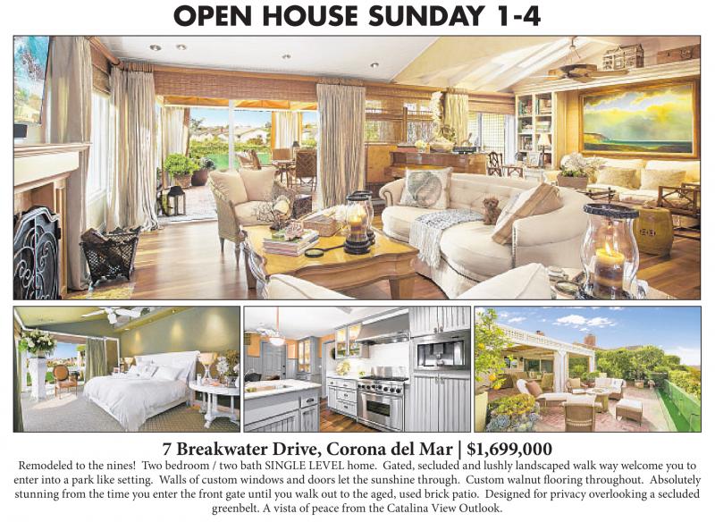 OPEN HOUSE SUNDAY 1-4 7 Breakwater Drive, Corona del Mar | $1,699,000 Remodeled to the nines! Two bedroom / two bath SINGLE LEVEL home. Gated, secluded and lushly landscaped walk way welcome you to enter into a park like setting. Walls of custom windows and doors let the sunshine through. Custom walnut flooring throughout. Absolutely stunning from the time you enter the front gate until you walk out to the aged, used brick patio. Designed for privacy overlooking a secluded greenbelt. A vista of peace from the Catalina View Outlook.