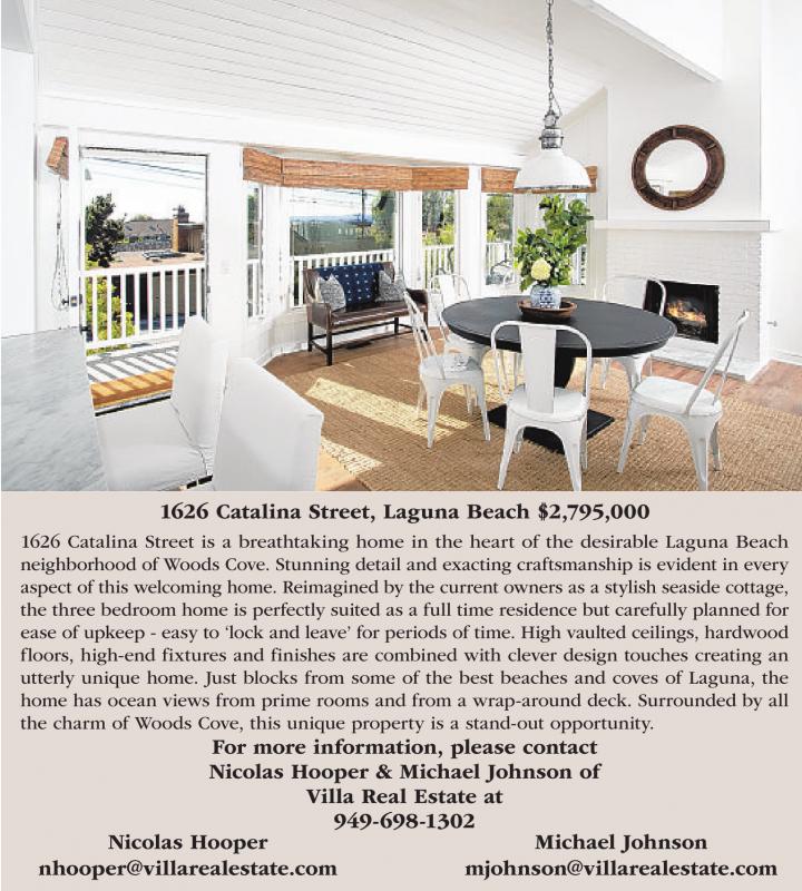 1626 Catalina Street, Laguna Beach $2,795,000 1626 Catalina Street is a breathtaking home in the heart of the desirable Laguna Beach neighborhood of Woods Cove. Stunning detail and exacting craftsmanship is evident in every aspect of this welcoming home. Reimagined by the current owners as a stylish seaside cottage, the three bedroom home is perfectly suited as a full time residence but carefully planned for ease of upkeep - easy to ‘lock and leave’ for periods of time. High vaulted ceilings, hardwood floors, high-end fixtures and finishes are combined with clever design touches creating an utterly unique home. Just blocks from some of the best beaches and coves of Laguna, the home has ocean views from prime rooms and from a wrap-around deck. Surrounded by all the charm of Woods Cove, this unique property is a stand-out opportunity. For more information, please contact Nicolas Hooper & Michael Johnson of Villa Real Estate at 949-698-1302 Nicolas Hooper nhooper@villarealestate.com Michael Johnson mjohnson@villarealestate.com