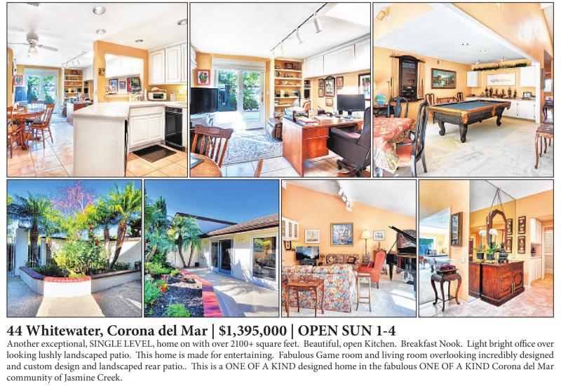 44 Whitewater, Corona del Mar | $1,395,000 | OPEN SUN 1-4 Another exceptional, SINGLE LEVEL, home on with over 2100+ square feet. Beautiful, open Kitchen. Breakfast Nook. Light bright office over looking lushly landscaped patio. This home is made for entertaining. Fabulous Game room and living room overlooking incredibly designed and custom design and landscaped rear patio.. This is a ONE OF A KIND designed home in the fabulous ONE OF A KIND Corona del Mar community of Jasmine Creek.