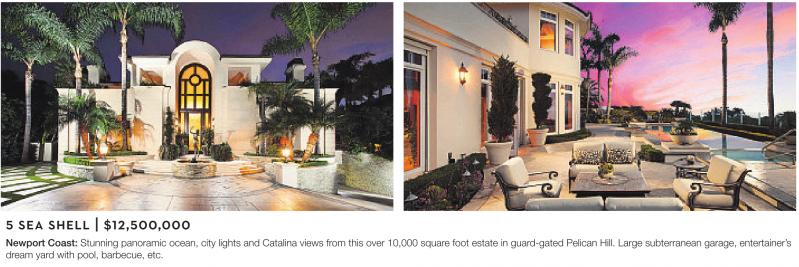 Newport Coast: Stunning panoramic ocean, city lights and Catalina views from this over 10,000 square foot estate in guard-gated Pelican Hill. Large subterranean garage, entertainer’s dream yard with pool, barbecue, etc.