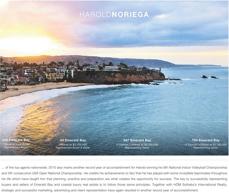 228 Emerald Bay Offered at $3,610,000 Represented Buyer 45 Emerald Bay Offered at $3,150,000 Represented Buyer & Seller 547 Emerald Bay In Escrow | Offered at $8,350,000 Representing Seller 704 Emerald Bay In Escrow | Offered at $3,100,000 Representing Seller ... of the top agents nationwide. 2015 also marks another record year of accomplishment for Harold winning his 8th National Indoor Volleyball Championship and 5th consecutive USA Open National Championship. He credits his achievements to fact that he has played with some incredible teammates throughout his life which have taught him that planning, practice and preparation are what creates the opportunity for success. The key to successfully representing buyers and sellers of Emerald Bay and coastal luxury real estate is to follow those same principles. Together with HÔM Sotheby’s International Realty, strategic and successful marketing, advertising and client representation have again resulted in another record year of accomplishment.