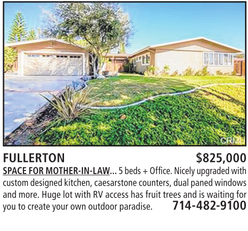 custom designedkitchen,caesarstone counters,dual panedwindows andmore.Hugelot with RV access has fruit treesand is waitingfor youtocreate your ownoutdoorparadise. 714-482-9100
