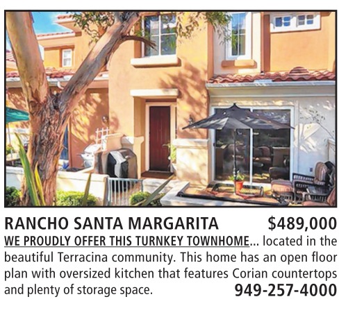 RANCHO SANTA MARGARITA $489,000 WE PROUDLY OFFER THIS TURNKEY TOWNHOME... located inthe beautiful Terracina community. This home has anopen floor plan with oversized kitchen that features Corian countertops andplentyofstoragespace. 949-257-4000
