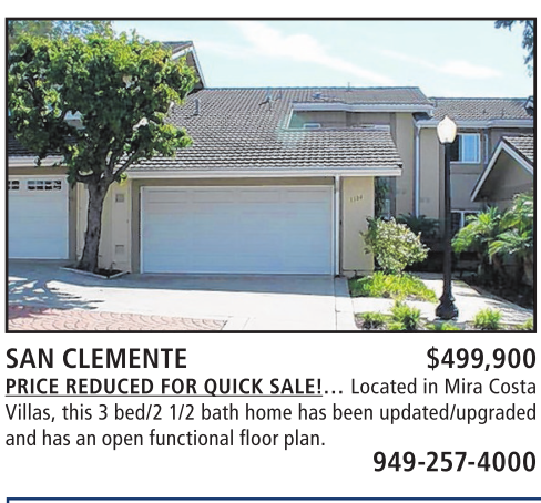 SAN CLEMENTE $499,900 PRICE REDUCED FOR QUICK SALE!… Located in Mira Costa Villas, this 3bed/2 1/2 bath home has been updated/upgraded andhas an openfunctional floor plan. 949-257-4000
