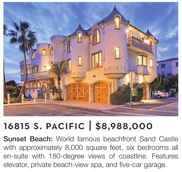 Sunset Beach: World famous beachfront Sand Castle with approximately 8,000 square feet, six bedrooms all en-suite with 180-degree views of coastline. Features elevator, private beach-view spa, and five-car garage.