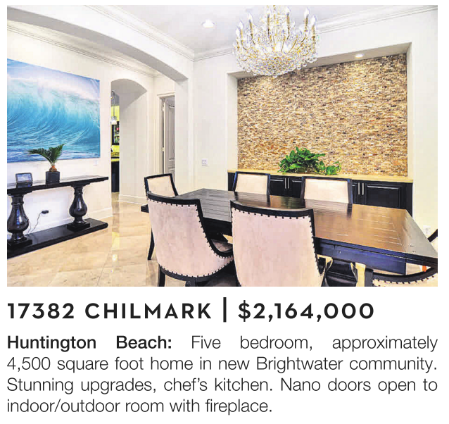 Huntington Beach: Five bedroom, approximately 4,500 square foot home in new Brightwater community. Stunning upgrades, chef’s kitchen. Nano doors open to indoor/outdoor room with fireplace.