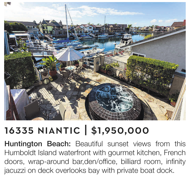 Huntington Beach: Beautiful sunset views from this Humboldt Island waterfront with gourmet kitchen, French doors, wrap-around bar,den/office, billiard room, infinity jacuzzi on deck overlooks bay with private boat dock.