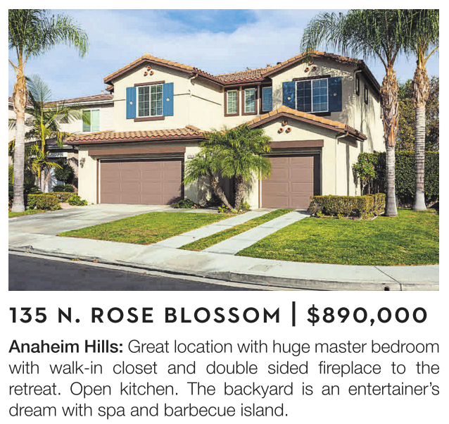 Anaheim Hills: Great location with huge master bedroom with walk-in closet and double sided fireplace to the retreat. Open kitchen. The backyard is an entertainer’s dream with spa and barbecue island.